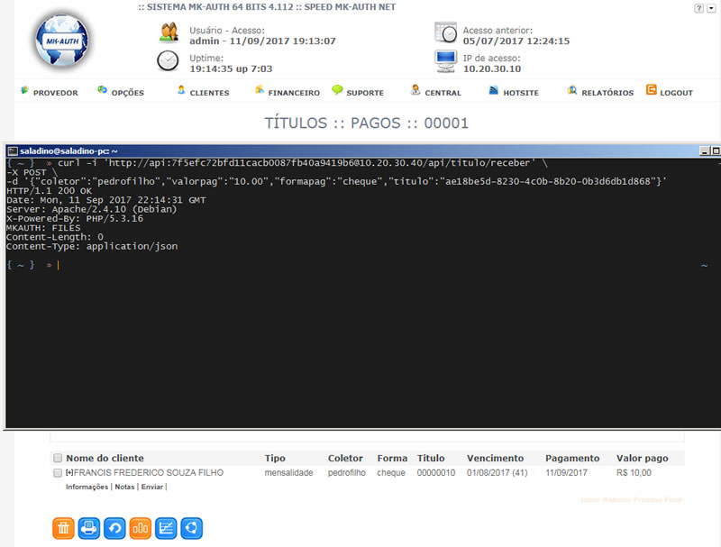 curl -i 'http://api:7f5efc72bfd11cacb0087fb40a9419b6@10.20.30.40/api/titulo/receber' \ -X POST \ -d '{"coletor":"pedrofilho","valorpag":"10.00","formapag":"cheque","titulo":"ae18be5d-8230-4c0b-8b20-0b3d6db1d868"}'